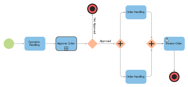 This BPMN (Business Process Model and Notation) diagram sample shows the order processing workflow. "In business or commerce, an order is a stated intention, either spoken or written, to engage in a commercial transaction for specific products or services. From a buyer's point of view it expresses the intention to buy and is called a purchase order. From a seller's point of view it expresses the intention to sell and is referred to as a sales order. When the purchase order of the buyer and the sales order of the seller agree, the orders become a contract between the buyer and seller. Within an organization, the term order may be used to refer to a work order for manufacturing, a preventive maintenance order, or an order to make repairs to a facility. In many businesses, orders are used to collect and report costs and revenues according to well-defined purposes. Then it is possible to show for what purposes costs have been incurred." [Order (business). Wikipedia] The business process modeling diagram example "Order process - BPMN 2.0 diagram" was designed using the ConceptDraw PRO diagramming and vector drawing software extended with the Business Process Diagram solution from the Business Processes area of ConceptDraw Solution Park.