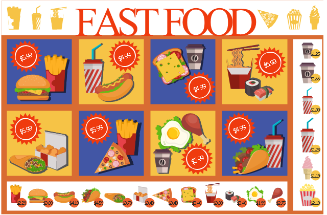 This food infogram example visualizes the fast food restaurant menu. "Fast food is the term given to food that is prepared and served very quickly... While any meal with low preparation time can be considered fast food, typically the term refers to food sold in a restaurant or store with preheated or precooked ingredients, and served to the customer in a packaged form for take-out/take-away. Fast food restaurants are traditionally separated by their ability to serve food via a drive-through." [en.wikipedia.org/wiki/Fast_food] The meal infographic example "Fast food menu" was designed using the ConceptDraw PRO diagramming and vector drawing software extended with the Food Court solution from the Food and Beverages area of ConceptDraw Solution Park.