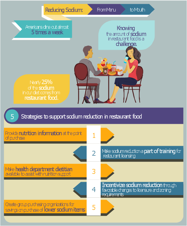 The diet infographics example "Food infogram - Reducing sodium" was drawn using the ConceptDraw PRO diagramming and vector drawing software extended with the Food Court solution from the Food and Beverages area of ConceptDraw Solution Park.