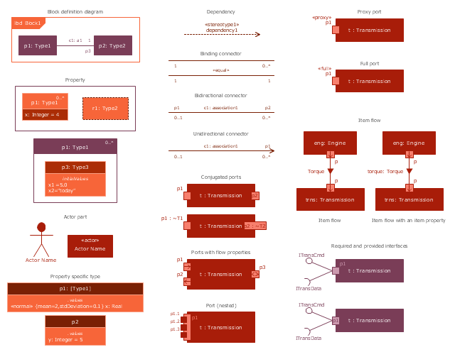 The SysML shapes example "Design elements - Internal block diagram" is included in the SysML solution from the Software Development area of ConceptDraw Solution Park.