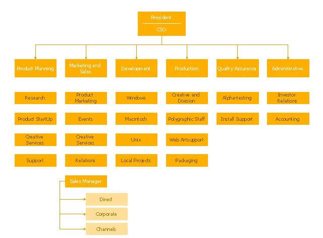 "A hierarchical organization is an organizational structure where every entity in the organization, except one, is subordinate to a single other entity. This arrangement is a form of a hierarchy. In an organization, the hierarchy usually consists of a singular/group of power at the top with subsequent levels of power beneath them. This is the dominant mode of organization among large organizations; most corporations, governments, and organized religions are hierarchical organizations with different levels of management, power or authority. ... Members of hierarchical organizational structures chiefly communicate with their immediate superior and with their immediate subordinates. Structuring organizations in this way is useful partly because it can reduce the communication overhead by limiting information flow; this is also its major limitation." [Hierarchical organization. Wikipedia] "A company's organizational chart typically illustrates relations between people within an organization. Such relations might include managers to sub-workers, directors to managing directors, chief executive officer to various departments, and so forth. When an organization chart grows too large it can be split into smaller charts for separate departments within the organization. The different types of organization charts include: Hierarchical, Matrix, Flat (also known as Horizontal)." [Organizational chart. Wikipedia] The org chart sample "Hierarchical organization" was created using the ConceptDraw PRO diagramming and vector drawing software extended with the 25 Typical Organizational Charts solution from the Management area of ConceptDraw Solution Park.