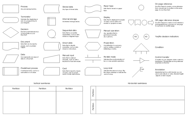 The vector stencils library "Cross-functional flowcharts" contains 31 symbols for creating the deployment flow charts using the ConceptDraw PRO diagramming and vector drawing software.