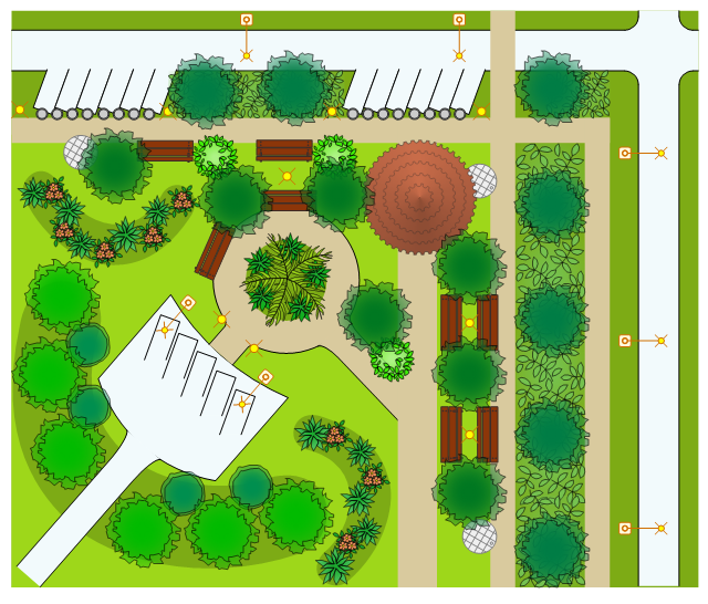 The landscape and garden design example "Park site plan" was created using the ConceptDraw PRO diagramming and vector drawing software extended with the Site Plans solution from the Building Plans area of ConceptDraw Solution Park.