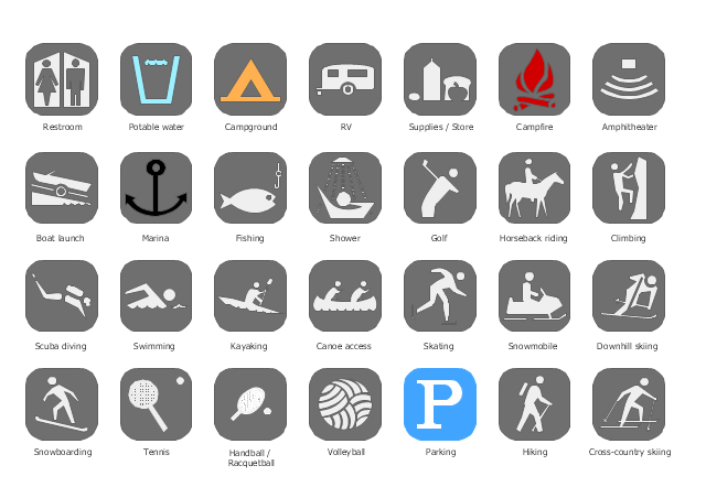 The vector stencils library "Recreation signs" contains 28 pictogram symbols for labeling the street and locator maps, road and route maps, transit and tourist maps with information signs using the ConceptDraw PRO diagramming and vector drawing software. "An information sign is a very legibly printed and very noticeable placard that informs people of the purpose of an object, or gives them instruction on the use of something. An example is a traffic sign such as a stop sign. Information signs have been growing in visibility due to the explosion of sign technologies." [Information sign. Wikipedia] "A tourist sign, often referred to as a brown sign, is a traffic sign whose purpose is to direct visitors to tourist destinations, such as historic buildings, tourist regions, caravan or camp sites, picnic areas, sporting facilities and cultural places such as museums. By international convention, brown signs with white lettering and white pictograms are often used for this purpose." [Tourist sign. Wikipedia] The vector stencils library "Recreation signs" is included in the Directional Maps solution from the Maps area of ConceptDraw Solution Park.