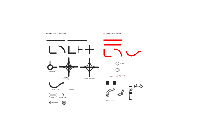 The vector stencils library "Roads and junctions" contains 38 symbols for creating the road and route maps, transit and directional maps, street and locator maps using the ConceptDraw PRO diagramming and vector drawing software.