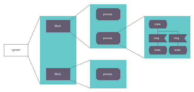 An SDL system is made of functional blocks and each block can be further decomposed in sub-blocks. The lowest level block is composed of one or several process described as finite state machines." [Specification and Description Language. Wikipedia]