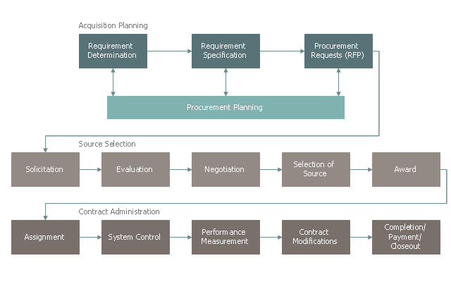 This business process flowchart example was redesigned from the Wikimedia Commons file: Contracting Process Line.jpg.