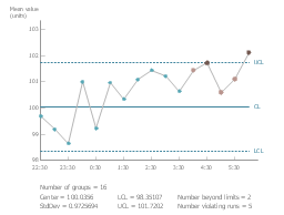 This example was redesigned from the Wikimedia Commons file: Xbar chart for a paired xbar and R chart.svg.