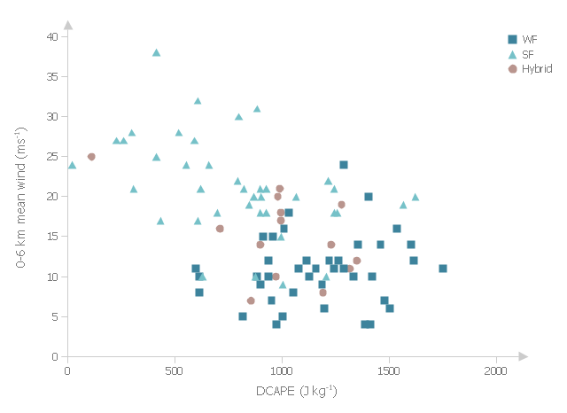 This example was drawn on the base of fig. 13 "Scatter plot of DCAPE versus 0-6 km mean wind" from the article "Examination of Derecho Environments Using Proximity Soundings" by Jeffry S. Evans on the website of Storm Prediction Center, National Oceanic and Atmospheric Administration.