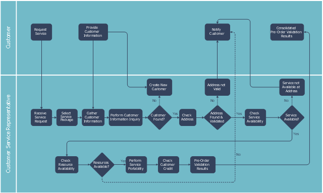 The cross-functional flowchart example "Providing telecom services" was created using the ConceptDraw PRO diagramming and vector drawing software extended with the Cross-Functional Flowcharts solution from the Business Processes area of ConceptDraw Solution Park.