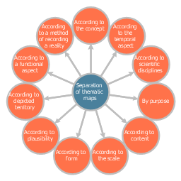 This circle-spoke diagram sample shows the basic division of thematic maps. It was designed on the base of the Wikimedia Commons file: Dělení tematických map.png.