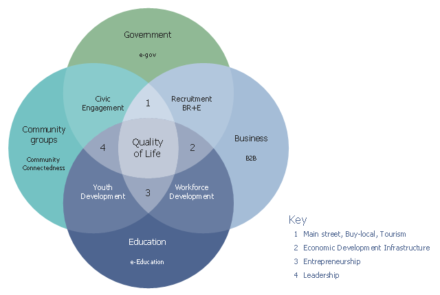This Venn diagram sample shows how community elements overlap. It was designed on the base of the figure 1 in the course "eStrategies for Local Governments" from the website of the Southern Rural Development Center (SRDC), the Mississippi State University.