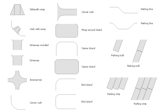 The vector stencils library Parking and roads contains 18 symbols of parking lots and strips, parking spaces, driveways, street junctions, and interchanges for parking facilities, on-street and off-street parking, and traffic management.