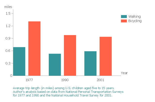 This bar graph sample shows the average trip length (in miles) among U.S. children aged five to 15 years. It was designed on the base of the figure 3 from the article "Childhood Obesity — What We Can Learn From Existing Data on Societal Trends, Part 2" on the U.S. Centers for Disease Control and Prevention (CDC) website. "Active transportation, such as walking or biking, can expend a large amount of energy, and it has been hypothesized that increased suburbanization reduces walking and biking. Only recently have transportation patterns and urban design in relation to physical activity and health attracted interest. Although research has been limited to cross-sectional comparisons and adults, it has shown an association between increases in sprawl and decreases in leisure time and utilitarian walking and increases in body mass index and chronic health conditions." [cdc.gov/pcd/issues/2005/apr/04_0039.htm] The column chart example "Average trip length among U.S. children" was created using the ConceptDraw PRO diagramming and vector drawing software extended with the Bar Graphs solution from the Graphs and Charts area of ConceptDraw Solution Park.