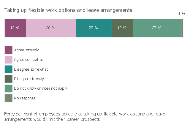 The chart example "Taking up flexible work options and leave arrangements" was created using the ConceptDraw PRO diagramming and vector drawing software extended with the Divided Bar Diagrams solution from the Graphs and Charts area of ConceptDraw Solution Park.