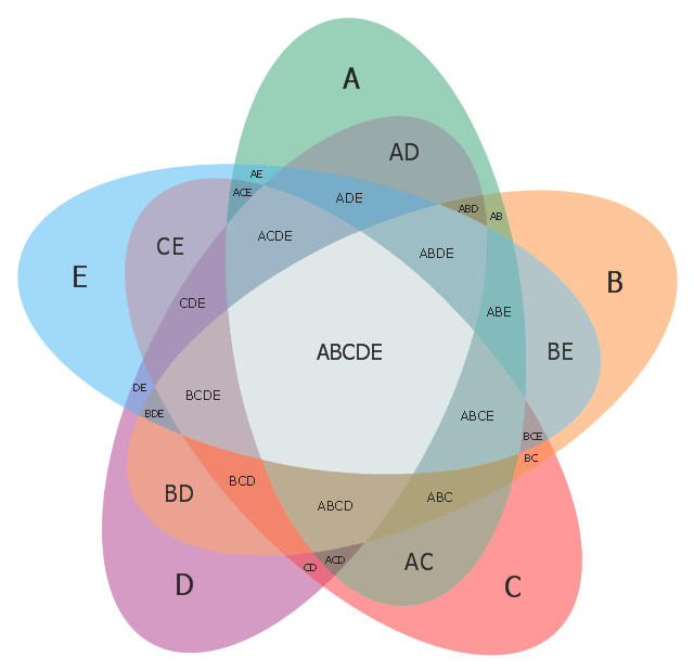 Use this template to design your five set Venn diagrams. "Five-set Venn diagram using congruent ellipses in a radially symmetrical arrangement devised by Branko Grünbaum. Labels have been simplified for greater readability." [Venn diagram. Wikipedia] The template "5-set Venn diagram" for the ConceptDraw PRO diagramming and vector drawing software is included in the Venn Diagrams solution from the area "What is a Diagram" of ConceptDraw Solution Park.