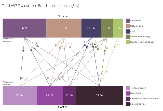 The chart example "U.S. primary energy consumption by source and sector" was created using the ConceptDraw PRO diagramming and vector drawing software extended with the Divided Bar Diagrams solution from the Graphs and Charts area of ConceptDraw Solution Park.