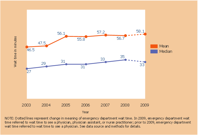 This line graph sample shows the mean and median wait time for treatment in hospital emergency department: United States, 2003–2009. Dotted lines represent change in meaning of emergency department wait time. In 2009, emergency department wait time referred to wait time to see a physician, physician assistant, or nurse practitioner; prior to 2009, emergency department wait time referred to wait time to see a physician. This line graph was designed on the base of line graph from the website of National Center for Health Statistics, Centers for Disease Control and Prevention (CDC), U.S. Department of Health & Human Services. [cdc.gov/nchs/products/databriefs/db102.htm] The line chart example "Wait time for treatment in hospital emergency departments" was created using the ConceptDraw PRO diagramming and vector drawing software extended with the Line Graphs solution from the Graphs and Charts area of ConceptDraw Solution Park.