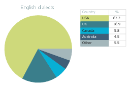 This pie chart sample shows the shares of the main English speaking countries in the total population of native English speakers in 1997. Only real native speakers are counted. This pie chart example was designed on the base of the Wikimedia Commons file: English dialects1997.png. [commons.wikimedia.org/wiki/File:English_dialects1997.png] The pie chart example "English dialects" was created using the ConceptDraw PRO diagramming and vector drawing software extended with the Pie Charts solution of the Graphs and Charts area in ConceptDraw Solution Park.