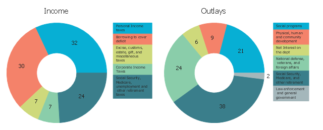 The donut charts example "Income and outlays" was created using the ConceptDraw PRO diagramming and vector drawing software extended with the Pie Charts solution of the Graphs and Charts area in ConceptDraw Solution Park.