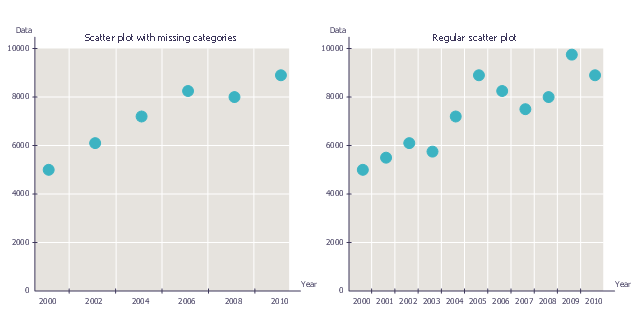 The chart example "Scatter plot with missing categories" was created using the ConceptDraw PRO diagramming and vector drawing software extended with the Scatter Diagrams solution from the Graphs and Charts area of ConceptDraw Solution Park.