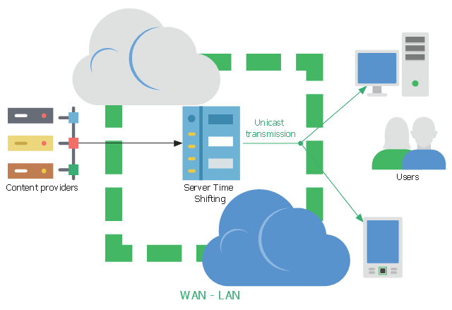 This network diagram sample shows the video on demand (VoD) architecture in a network video recorder (NVR) enviroment. It was designed on the base of Wikimedia Commons file: BaixdemandaArchitecture.png. [commons.wikimedia.org/wiki/File:BaixdemandaArchitecture.png] This file is licensed under the Creative Commons Attribution-Share Alike 3.0 Unported license. [creativecommons.org/licenses/by-sa/3.0/deed.en] "Video on demand (display) (VOD) are systems which allow users to select and watch/listen to video or audio content when they choose to, rather than having to watch at a specific broadcast time. IPTV technology is often used to bring video on demand to televisions and personal computers." [Video on demand. Wikipedia] The network diagram example "VoD architecture in a NVR enviroment" was created using the ConceptDraw PRO diagramming and vector drawing software extended with the Computers and Communications solution from the Illustration area of ConceptDraw Solution Park.