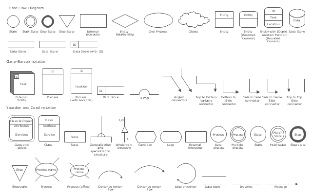 The Data Flow Diagrams solution from the Software Development area of ConceptDraw Solution Park provides three vector stencils libraries for drawing DFD using the ConceptDraw PRO diagramming and vector drawing software . The design elements library "Data flow diagram (DFD)" contains 15 symbols for drawing both context-level data flow diagram and Level 1 DFD. The design elements library "DFD, Gane-Sarson notation contains 12 symbols of Gane-Sarson DFD notation. The design elements library "DFD, Yourdon and Coad notation contains 22 symbols of Yourdon/DeMarco DFD notation.