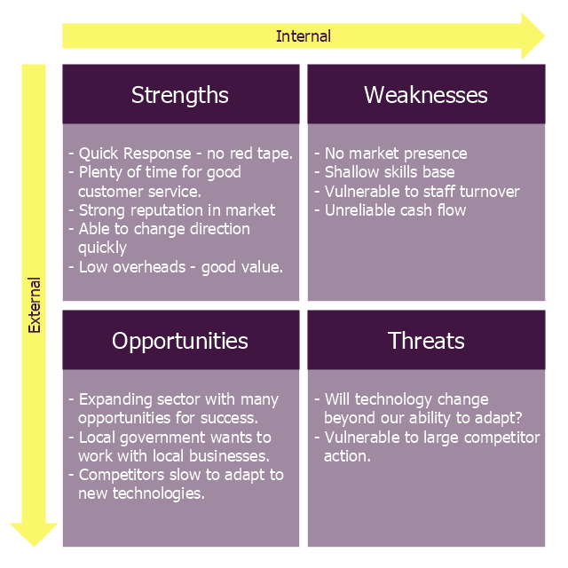 The diagram example "Small business consultancy SWOT analysis matrix" was created using the ConceptDraw PRO diagramming and vector drawing software extended with the SWOT Analysis solution from the Management area of ConceptDraw Solution Park.