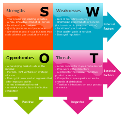 "SWOT analysis is an analytical method which is used to identify and categorise significant internal (Strengths and Weaknesses) and external (Opportunities and Threats) factors faced either in a particular arena, such as an organisation, or a territory, such as a region, nation, or city.