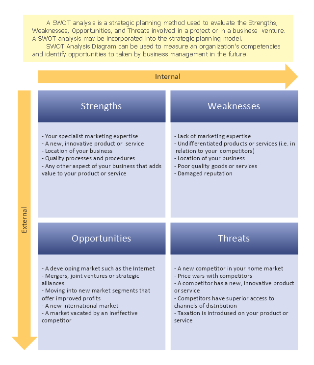 SWOT analysis is a strategic planning method for evaluation of Strengths, Weaknesses, Opportunities, and Threats of a project or a business venture. It may be the part of strategic planning model. SWOT Diagrams are used to measure an organization's competencies and identify opportunities to taken by management in the future.