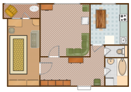 The Apartment plan example shows the layout of furniture, kitchen equipment and bathroom appliance on the interioir design floor plan.