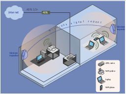 This diagram sample shows how Wi-Fi repeater and access point extends coverage of the wireless network. "A wireless repeater (also called wireless range extender) takes an existing signal from a wireless router or wireless access point and rebroadcasts it to create a second network. When two or more hosts have to be connected with one another over the IEEE 802.11 protocol and the distance is too long for a direct connection to be established, a wireless repeater is used to bridge the gap. It can be a specialized stand alone computer networking device. Also, some Wireless network interface controllers (WNIC)s optionally support operating in such a mode. Those outside of the primary network will be able to connect through the new "repeated" network. However, as far as the original router or access point is concerned, only the repeater MAC is connected, making it necessary to enable safety features on the wireless repeater. Wireless repeaters are commonly used to improve signal range and strength within homes and small offices." [Wireless repeater. Wikipedia] The wireless network diagram example "Wi-Fi repeater" was created using the ConceptDraw PRO diagramming and vector drawing software extended with the Wireless Networks solution from the Computer and Networks area of ConceptDraw Solution Park.