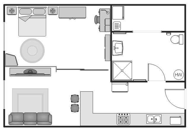 Floor plan, window, casement, water heater, washing machine, wardrobe, wall cabinet, wall, towel rack, toilet paper holder, toilet, table lamp, sofa, sliding glass door, shower, round stool, round rug, room divider, rolling chair, rectangular table, rectangular rug, rectangular room, pedestal sink, rectangular freestanding sink, microwave, hamper, gas range, food cooler, flat screen TV, drawing shapes, double sink, double bed, doorway, opening, door, desk lamp, desk, bent counter, base end angle, base end angle cabinet, base cabinets,