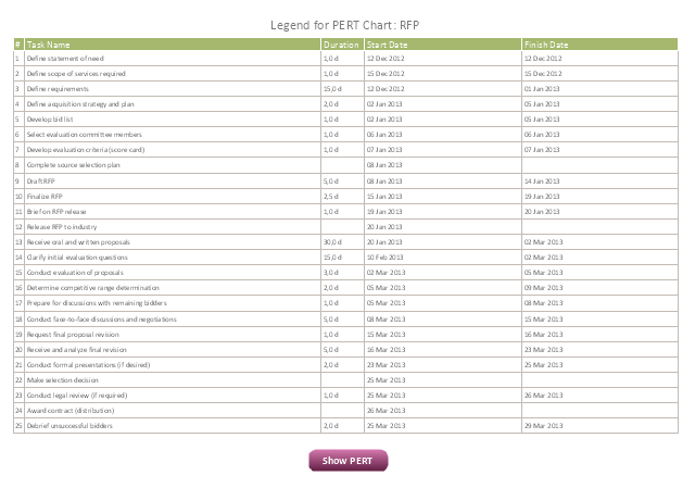 "A request for proposal (RFP) is a solicitation made, often through a bidding process, by an agency or company interested in procurement of a commodity, service or valuable asset, to potential suppliers to submit business proposals. It is submitted early in the procurement cycle, either at the preliminary study, or procurement stage. The RFP process brings structure to the procurement decision and is meant to allow the risks and benefits to be identified clearly up front. The RFP presents preliminary requirements for the commodity or service, and may dictate to varying degrees the exact structure and format of the supplier's response. Effective RFPs typically reflect the strategy and short/long-term business objectives, providing detailed insight upon which suppliers will be able to offer a matching perspective. Similar requests include a request for quotation and a request for information. In principle, an RFP: (1) informs suppliers that an organization is looking to procure and encourages them to make their best effort. (2) requires the company to specify what it proposes to purchase. If the requirements analysis has been prepared properly, it can be incorporated quite easily into the Request document. (3) alerts suppliers that the selection process is competitive. (4) allows for wide distribution and response. (5) ensures that suppliers respond factually to the identified requirements. (6) is generally expected to follow a structured evaluation and selection procedure, so that an organization can demonstrate impartiality - a crucial factor in public sector procurements." [Request for proposal. Wikipedia] The PERT chart example "Request for proposal (RFP)" was created using the ConceptDraw PRO diagramming and vector drawing software extended with the solution Seven Management and Planning Tools from the Management area of ConceptDraw Solution Park.