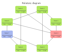Relation diagram (interrelationship digraph, relationships digram) helps identify what factors are causes and which factors are effects. Factors help establish KPI (Key Performance Indicators) to monitor changes and the effectiveness of corrective actions in resolving a problem.