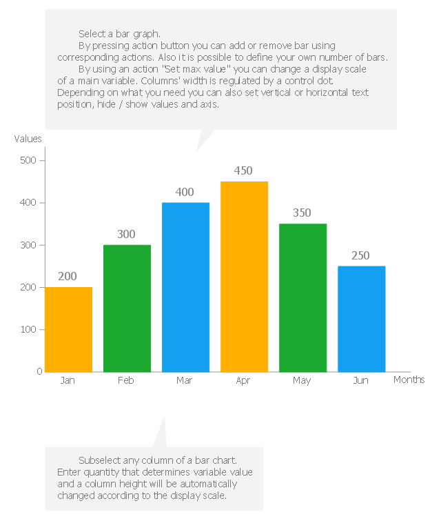 Use this column chart template to design your vertical bar graphs in the ConceptDraw PRO diagramming and vector drawing software. "Bar charts have a discrete range. Bar charts are usually scaled so all the data can fit on the chart. Bars on the chart may be arranged in any order. Bar charts arranged from highest to lowest incidence are called Pareto charts. Normally, bars showing frequency will be arranged in chronological (time) sequence. Grouped bar graph usually present the information in the same order in each grouping. Stacked bar graphs present the information in the same sequence on each bar. Bar charts provide a visual presentation of categorical data. Categorical data is a grouping of data into discrete groups, such as months of the year, age group, shoe sizes, and animals. These categories are usually qualitative. In a column bar chart, the categories appear along the horizontal axis; the height of the bar corresponds to the value of each category." [Bar chart. Wikipedia] The bar graph template "Bar chart" is included in the Basic Bar Graphs solution from the Graphs and Charts area of ConceptDraw Solution Park.