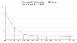This line graph sample depicts the value of the old French franc in the post-war period, in 2007 Euros. It was designed on the base of the Wikimedia Commons file: FrancEuro1944-1959.png [commons.wikimedia.org/wiki/File:FrancEuro1944-1959.png].