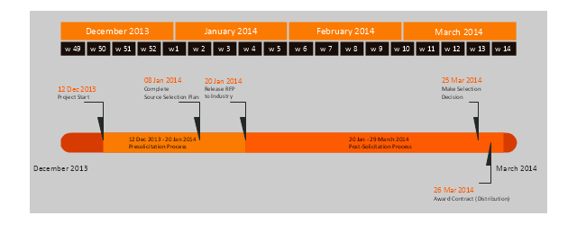 The project plan timeline diagram example "Request for proposal (RFP)" was created using the ConceptDraw PRO diagramming and vector drawing software extended with the Timeline Diagrams solution from the Management area of ConceptDraw Solution Park.