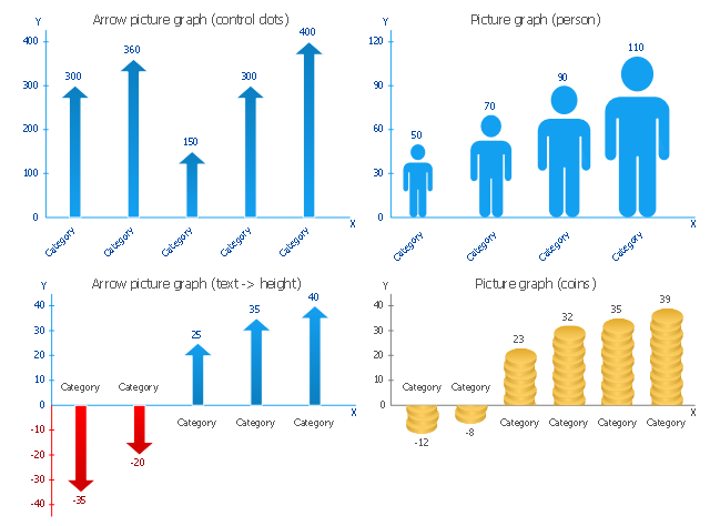 The vector stencils library "Picture Graphs" contains 4 image chart templates. Use it to design your pictorial bar charts in ConceptDraw PRO diagramming and vector drawing software. "Pictorial bar graph. Sometimes reffered to as a pictographs. A pictorial bar graph is a graph in which the rectangular bars have been filled with pictures, sketches, icons, etc. or where pictures, sketches, icons, etc. have been substituted for the rectangular bars. In both variations, one or more symbols might be used in each bar. The two major reasons for using pictorial graphs are to make the graph more appealing visually and to facilitate better communications." [Information Graphics: A Comprehensive Illustrated Reference. R. L. Harris. 1999. p.41] The chart templates example "Design elements - Picture graphs" is included in the Basic Picture Graphs solution from the Graphs and Charts area of ConceptDraw Solution Park.