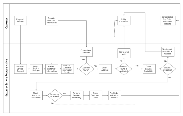 The swim lane diagram example "Process flowchart - Providing telecom services" was created using the ConceptDraw PRO diagramming and vector drawing software extended with the Process Flowcharts solution from the Business Processes area of ConceptDraw Solution Park.