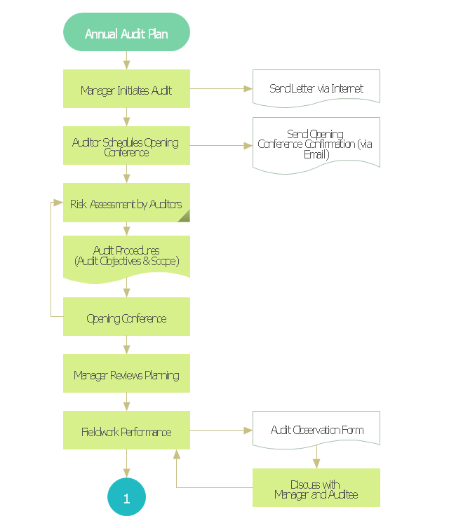 The audit flowchart example "Audit process flowchart" was created using the ConceptDraw PRO diagramming and vector drawing software extended with the Audit Flowcharts solution from the Finance and Accounting area of ConceptDraw Solution Park.