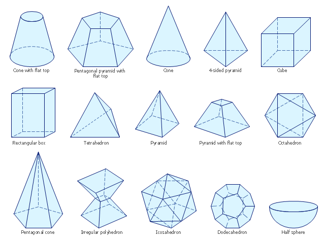 The vector stencils library "Solid geometry" contains 15 shapes of solid geometric figures. "In mathematics, solid geometry was the traditional name for the geometry of three-dimensional Euclidean space - for practical purposes the kind of space we live in. It was developed following the development of plane geometry. Stereometry deals with the measurements of volumes of various solid figures including cylinder, circular cone, truncated cone, sphere, and prisms. The Pythagoreans had dealt with the regular solids, but the pyramid, prism, cone and cylinder were not studied until the Platonists. Eudoxus established their measurement, proving the pyramid and cone to have one-third the volume of a prism and cylinder on the same base and of the same height, and was probably the discoverer of a proof that the volume of a sphere is proportional to the cube of its radius." [Solid geometry. Wikipedia] The shapes example "Design elements - Solid geometry" was created using the ConceptDraw PRO diagramming and vector drawing software extended with the Mathematics solution from the Science and Education area of ConceptDraw Solution Park.