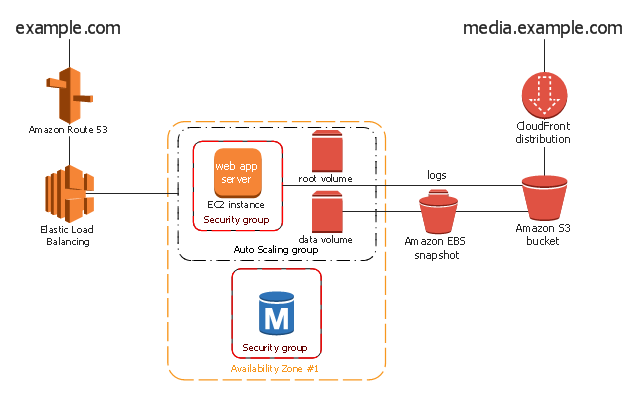 The AWS architecture diagram example "2-Tier Auto-scalable Web Application Architecture in 1 Zone" was created using the ConceptDraw PRO diagramming and vector drawing software extended with the AWS Architecture Diagrams solution from the Computer and Networks area of ConceptDraw Solution Park.