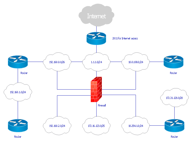 "... logical topology shows how data flows within a network, regardless of its physical design. ... ... mapping the data flow between the components determines the logical topology of the network." [Network topology. Wikipedia] "In a shared media topology, all the systems have the ability to access the physical layout whenever they need it. The main advantage in a shared media topology is that the systems have unrestricted access to the physical media. Of course, the main disadvantage to this topology is collisions. If two systems send information out on the wire at the same time, the packets collide and kill both packets. Ethernet is an example of a shared media topology. ... The token-based topology works by using a token to provide access to the physical media. In a token-based network, there is a token that travels around the network. When a system needs to send out packets, it grabs the token off of the wire, attaches it to the packets that are sent, and sends it back out on the wire. As the token travels around the network, each system examines the token. When the packets arrive at the destination systems, those systems copy the information off of the wire and the token continues its journey until it gets back to the sender. When the sender receives the token back, it pulls the token off of the wire and sends out a new empty token to be used by the next machine." [Logical topology. Wikipedia] This Cisco logical computer network diagram example was created using the ConceptDraw PRO diagramming and vector drawing software extended with the Cisco Network Diagrams solution from the Computer and Networks area of ConceptDraw Solution Park.