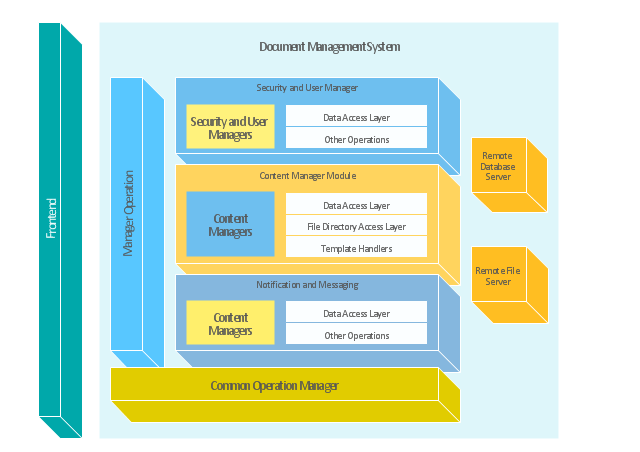 "A document management system (DMS) is a computer system (or set of computer programs) used to track and store electronic documents. It is usually also capable of keeping track of the different versions modified by different users (history tracking). The term has some overlap with the concepts of content management systems. It is often viewed as a component of enterprise content management (ECM) systems and related to digital asset management, document imaging, workflow systems and records management systems. ... Document management systems commonly provide storage, versioning, metadata, security, as well as indexing and retrieval capabilities." [Document management system. Wikipedia] The block diagram example "Document management system architecture" was created using the ConceptDraw PRO diagramming and vector drawing software extended with the Block Diagrams solution from the area "What is a Diagram" of ConceptDraw Solution Park.