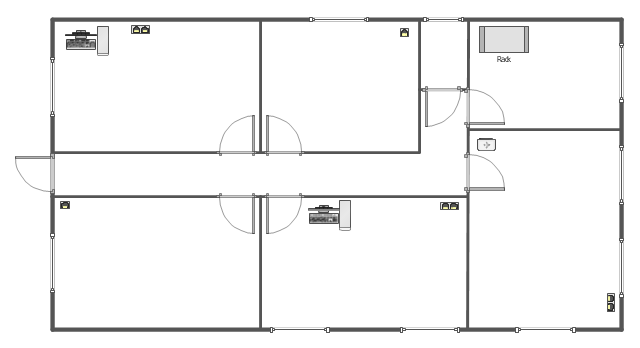 LAN equipment and cabling layout floorplan template, window, wall, single outlet, router, rack mount, duplex outlet, door, PC,