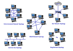 "Network topology is the arrangement of the various elements (links, nodes, etc.) of a computer network. Essentially, it is the topological structure of a network, and may be depicted physically or logically. Physical topology refers to the placement of the network's various components, including device location and cable installation, while logical topology shows how data flows within a network, regardless of its physical design. Distances between nodes, physical interconnections, transmission rates, and/or signal types may differ between two networks, yet their topologies may be identical. The study of network topology recognizes eight basic topologies: Point-to-point, Bus, Star, Ring or circular, Mesh, Tree, Hybrid, Daisy chain." [Network topology. Wikipedia]