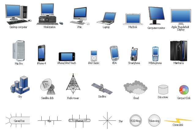 Computer network icons, workstation, star network, smartphone, satellite dish, satellite, radio tower, mobile phone, cell phone, mainframe, laptop computer, iPod Classic, iPhone, iPod Touch, iPhone 4, iMac desktop, desktop computer, desktop PC, data store, curved bus, computer monitor, compact disk, cloud, city, bus, Token-ring, PDA, MacBook, Mac Pro, FDDI ring, Ethernet, Comm-link, Apple Thunderbolt Display,