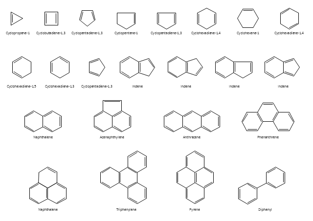 The vector stencils library "Aromatics" contains 23 symbols of aromatic rings for chemical drawing of molecular structural formulas and reaction mechanism schemes in organic chemistry. "An aromatic hydrocarbon or arene (or sometimes aryl hydrocarbon) is a hydrocarbon with alternating double and single bonds between carbon atoms forming rings. The term 'aromatic' was assigned before the physical mechanism determining aromaticity was discovered, and was derived from the fact that many of the compounds have a sweet scent. The configuration of six carbon atoms in aromatic compounds is known as a benzene ring, after the simplest possible such hydrocarbon, benzene. Aromatic hydrocarbons can be monocyclic (MAH) or polycyclic (PAH)." [Aromatic hydrocarbon. Wikipedia] The chemical symbols example "Design elements - Aromatic hydrocarbons (arenes)" was created using the ConceptDraw PRO software extended with the Chemistry solution from the Science and Education area of ConceptDraw Solution Park.