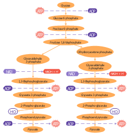 Glycolysis pathway map, water, pyruvic acid, pyruvate, phosphoenolpyruvic acid, PEP, phosphoenolpyruvate, nicotinamide adenine dinucleotide, NADH, nicotinamide adenine dinucleotide, NAD, glyceraldehyde 3-phosphate, triose phosphate, 3-phosphoglyceraldehyde, G3P, GADP, GAP, TP, GALP, PGAL, glucose, D-glucose, dextrose, grape sugar, glucose 6-phosphate, Robison ester, glucose 6-phosphate, fructose 1,6-bisphosphate, Harden-Young ester, dihydroxyacetone phosphate, DHAP, glycerone phosphate, adenosine triphosphate, ATP, adenosine diphosphate, ADP, 3-phosphoglyceric acid, 3PG, glycerate 3-phosphate, GP, 2-phosphoglyceric acid, 2PG, 2-phosphoglycerate, 13-bisphosphoglyceric acid, 13-bisphosphoglycerate, 13BPG,